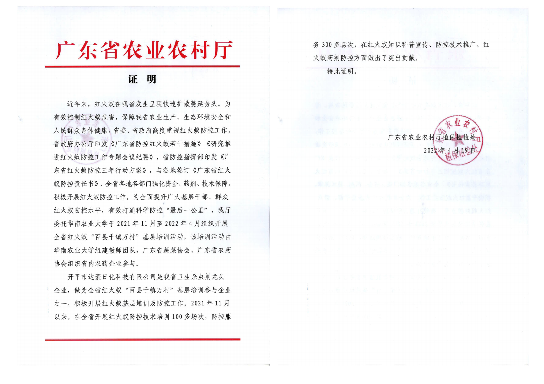 2022年 获广东省农业农村厅表彰红火蚁防控突出贡献
