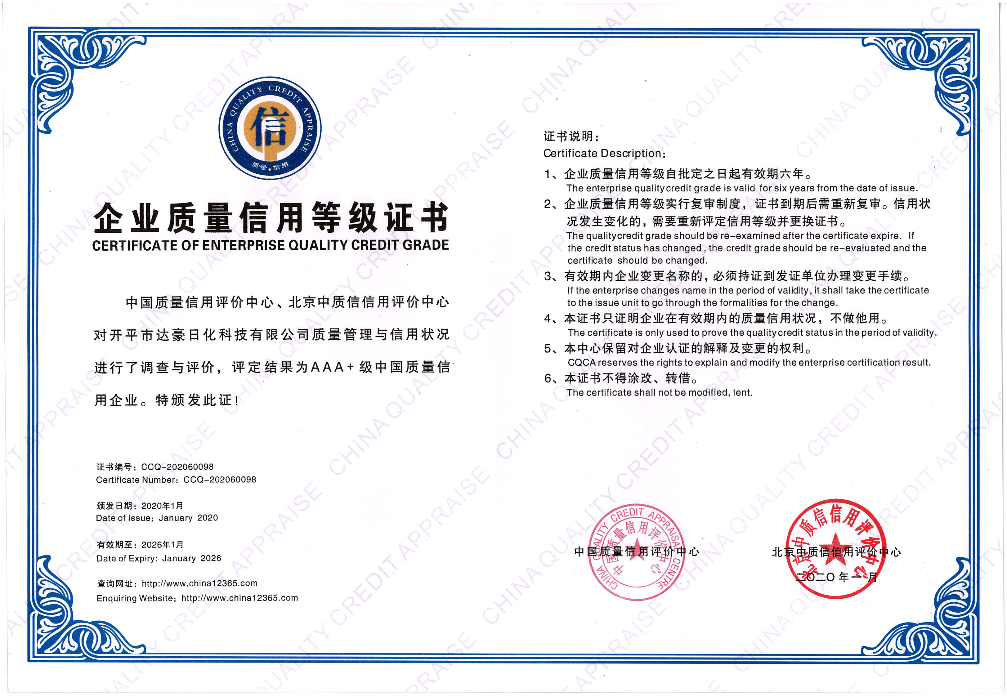 2020年 荣获AAA+级中国质量信用企业