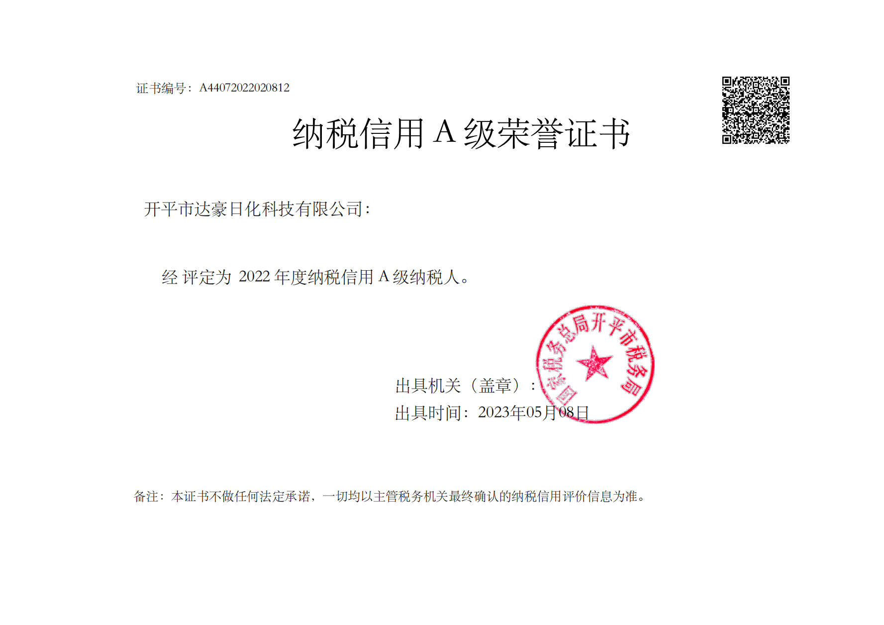 2022年度 纳税信用A级纳税人
